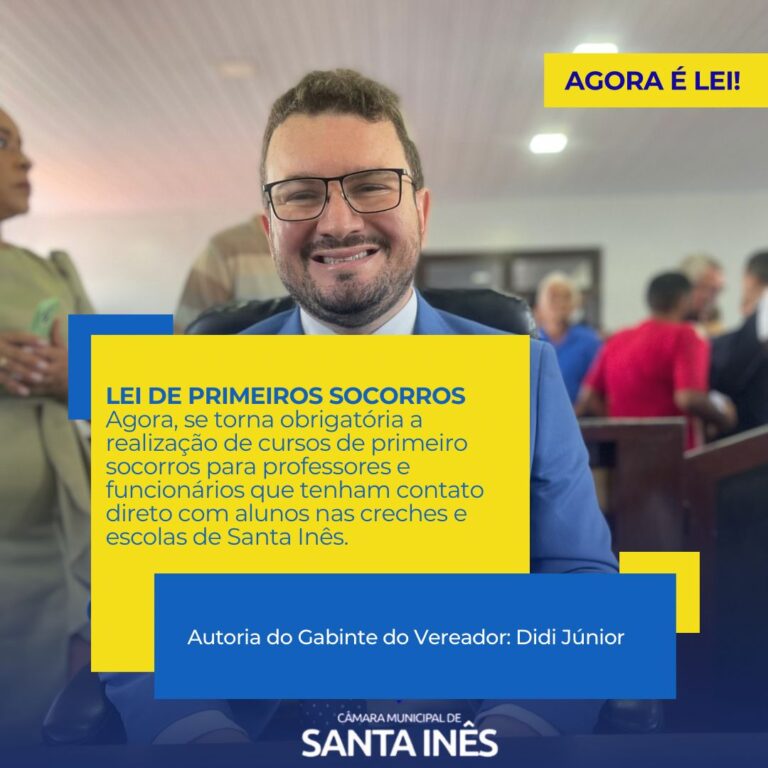 LEI DE PRIMEIROS SOCORROS Agora, se torna obrigatória a realização de cursos de primeiro socorros para professores e funcionários que tenham contato direto com alunos nas creches e escolas de Santa Inês.